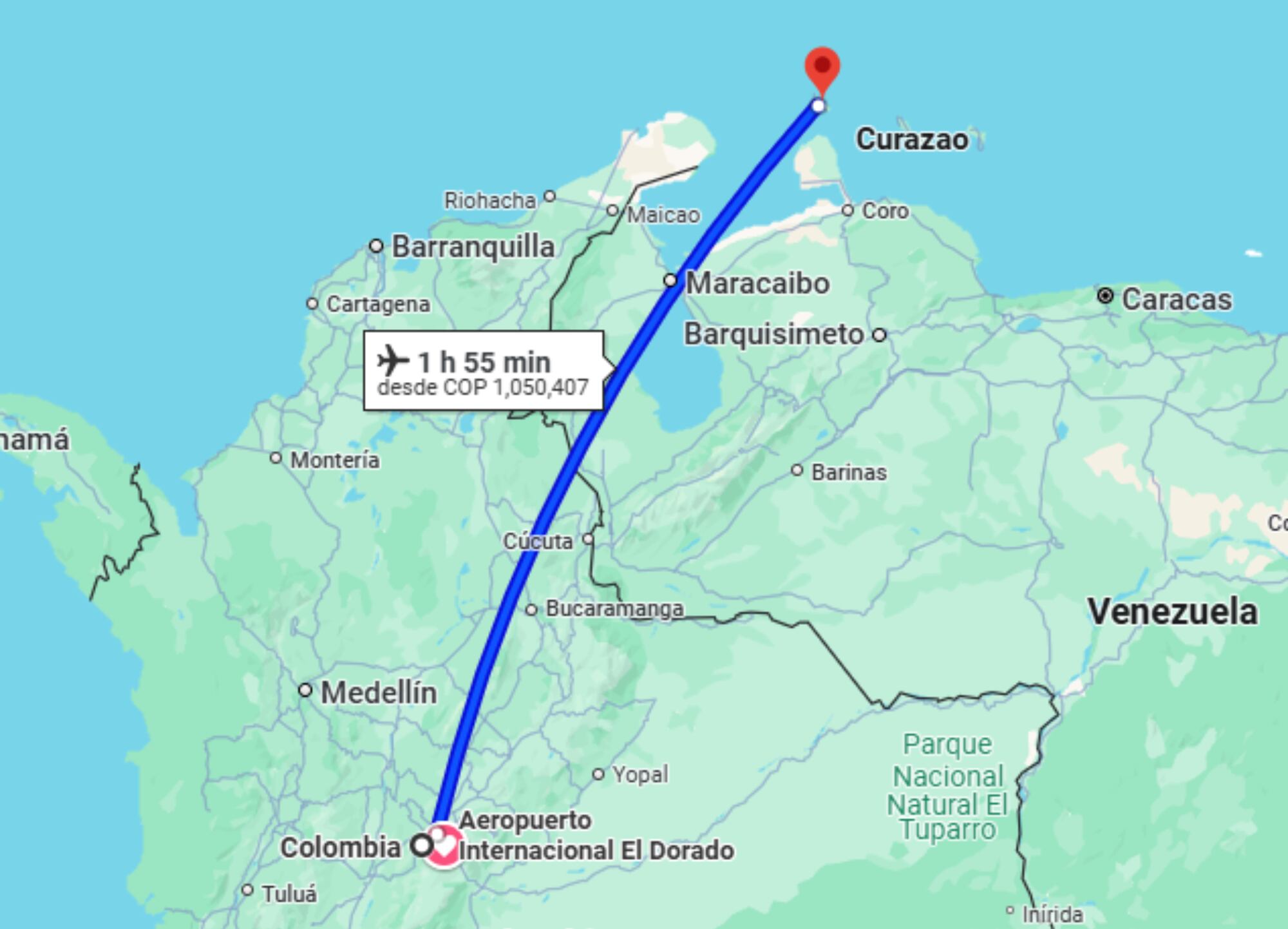 Según Google Maps, un vuelo desde Bogotá hasta Aruba tardaría solo 1 hora y 55 minutos, mucho menos que varios viajes por tierra en Colombia.