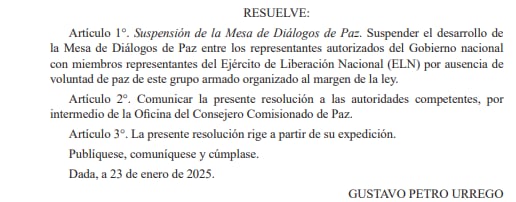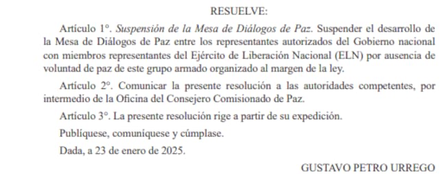 En los últimos días, el presidente Gustavo Petro oficializó la suspensión de los diálogos de paz con el ELN a través de la resolución ejecutiva número 015 de 2025, en la que se resolvió “suspender el desarrollo de la Mesa de Diálogos de Paz entre los representantes autorizados del Gobierno Nacional con miembros representantes del Ejército de Liberación Nacional (ELN), por ausencia de voluntad de paz de este grupo armado organizado al margen de la ley”.