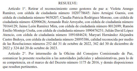 En la resolución 017 de 2025 se resolvió “retirar el reconocimiento como gestores de paz a Violeta Arango Ramírez, Jairo Arruigui Guenis, Claudia Patricia Rodríguez Moreno, Armando Ruíz Arroyabe, Jaime León Ramírez Mira, Ramón Emilio Montejo Ureña, Julián David López Atencio, Maryuri Alejandra Castro Bedoya (…)”.