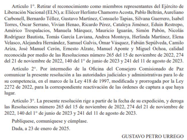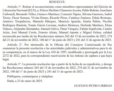 En el comunicado publicado por el Diario Oficial, el presidente Petro también anunció el retiro de la calidad de gestores de paz a distintos miembros del ELN que habían sido reconocidos a través de las resoluciones 252 del 31 de octubre de 2022, 342 del 20 de diciembre de 2022 y 324 del 20 de octubre de 2023.
