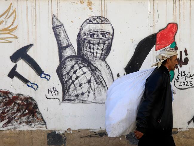 Saná (Yemen), 27/01/2025.- Una persona camina junto a un grafiti propalestino pintado en un muro en solidaridad con los palestinos. / YAHYA ARHAB (EFE)