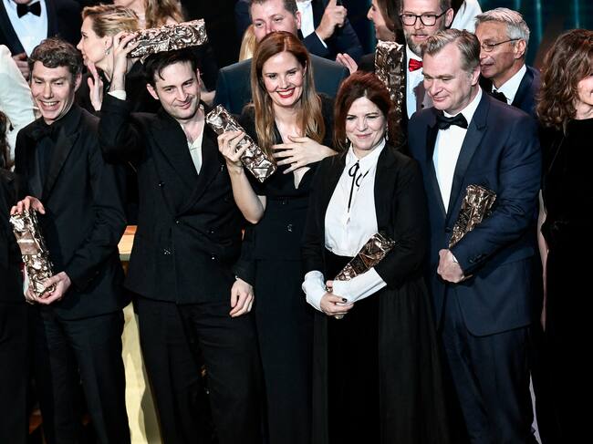 La directora y guionista Justine Triet, la actriz Agnes Jaoui, el cineasta Christopher Nolan y la presidenta de la ceremonia Valerie Lemercier posan al final de la 49ª edición de los Premios César de Cine, en el Olympia de París, el 23 de febrero de 2024. AFP vía Getty Images / STEPHANE DE SAKUTIN