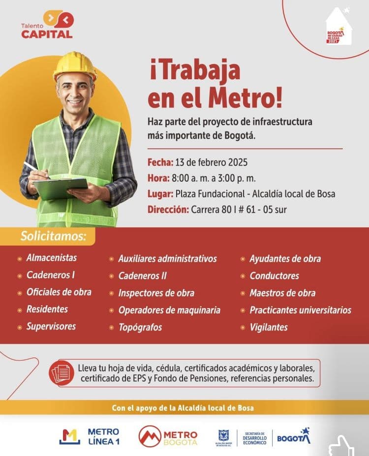 La Alcaldía de Bogotá, a través de la estrategia ‘Talento Capital’, dio a conocer que se abrieron 480 vacantes de empleo para trabajar en las obras de la Línea 1 del Metro. Las personas interesadas deberán asistir el próximo jueves 13 de febrero a la Plaza Fundacional de Bosa para acceder a estas ofertas laborales.
