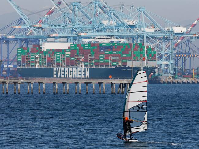 Long Beach (Usa), 04/02/2025.- Una persona navega cerca de un barco con contenedores de carga Evergreen en el Puerto de Los Ángeles. / CAROLINE BREHMAN (EFE)