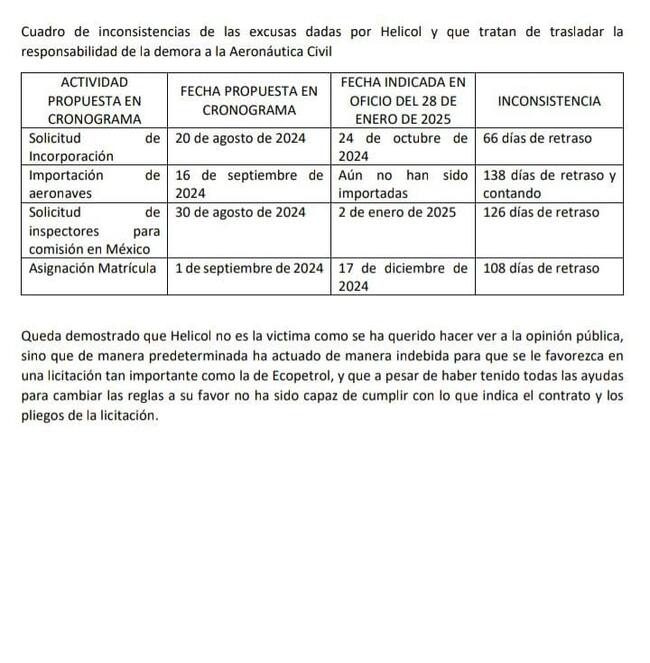 La W accedió al cronograma de la Aeronáutica Civil en el que se evidencia el incumplimiento de Helicol.