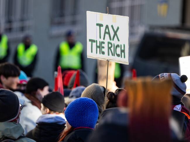 14 de enero de 2024, Suiza, Davos: Un cartel reza «Impuestos a los ricos». Cientos de personas se manifestaron por la justicia climática tras un estudio de Oxfam que señala que los superricos se hacen más ricos pese a la inflación y las crisis. (Hannes P Albert/picture alliance vía Getty Images)
