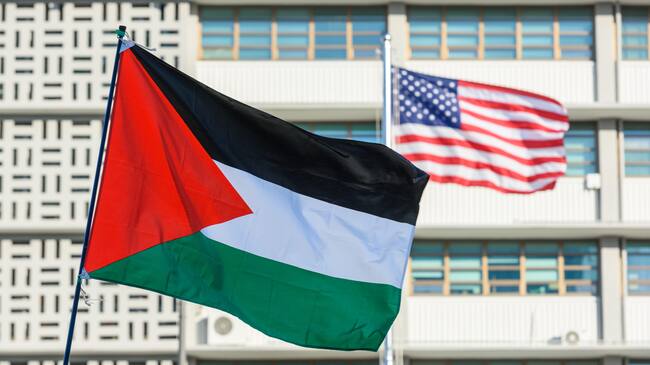 Bandera Palestina y bandera de Estados Unidos. FOTO: Kim Jae-Hwan/SOPA Images/LightRocket via Getty Images) / SOPA Images
