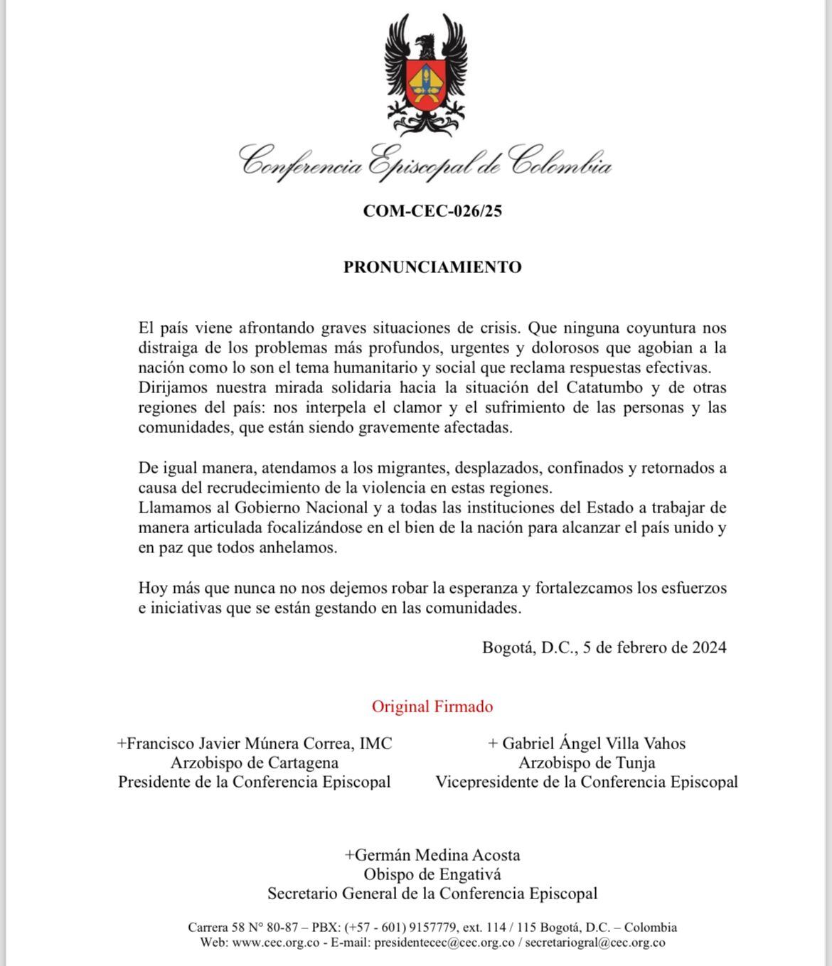 “Dirijamos nuestra mirada solidaria hacia la situación del Catatumbo y otras regiones del país: nos interpela el clamor y el sufrimiento de las personas y las comunidades, que están siendo gravemente afectadas. De igual manera, atendamos a los migrantes, desplazados, confinados y retornados a causa del recrudecimiento de la violencia en estas regiones”.