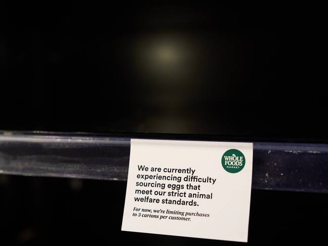 LOS ÁNGELES (Estados Unidos), 05/02/2025.- Un cartel notifica a los clientes la actual escasez de huevos y el aumento de los precios en una tienda de comestibles por cuenta de los casos de gripe aviar. / ALLISON DINNER (EFE)