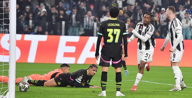 Turin (Italy), 11/02/2025.- Juventus' Samuel Mbangula (2-R) celebrates scoring the 2-1 goal during the UEFA Champions League play-offs first leg soccer match between Juventus FC and PSV Eindhoven, in Turin, Italy, 11 February 2025. (Liga de Campeones, Italia) EFE/EPA/ALESSANDRO DI MARCO / ALESSANDRO DI MARCO (EFE)