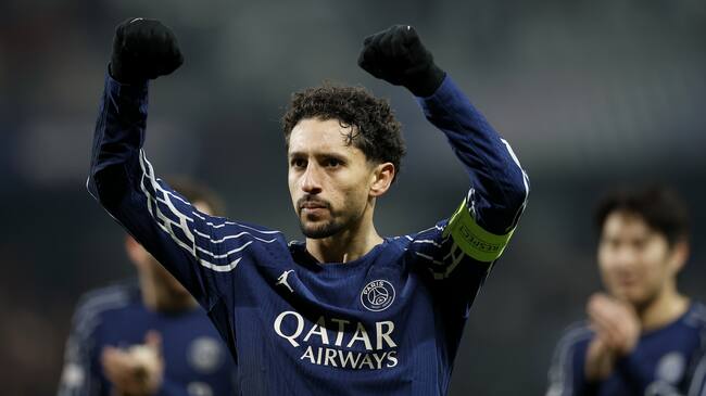 GUINGAMP (France), 11/02/2025.- PSG captain Marquinhos and teammates celebrate towards fans after winning the UEFA Champions League knockout phase play-offs 1st leg match between Stade Brest and Paris Saint-Germain, in Guingamp, France, 11 February 2025. (Liga de Campeones, Francia) EFE/EPA/YOAN VALAT / YOAN VALAT (EFE)