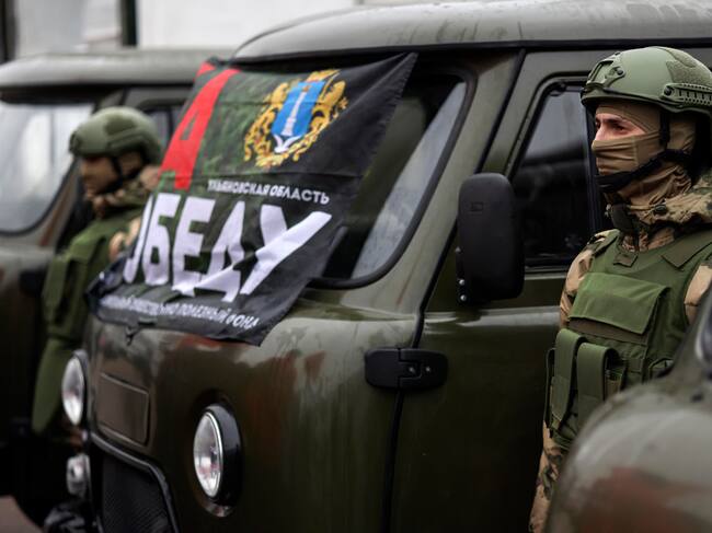 Moscú (Federación Rusa), 29/01/2025.- Militares rusos permanecen cerca de vehículos todoterreno durante el envío del 133º convoy humanitario reunido por el Partido Comunista Ruso, destinado al ejército ruso y a los residentes de las regiones de Kursk, Donetsk y Luhansk. / SERGEI ILNITSKY (EFE)