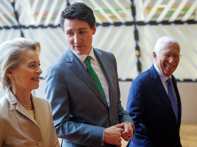 Justin Trudeau, Ursula von der Leyen y Antonio costa en Bruselas. FOTO: EFE/EPA/OLIVIER MATTHYS / OLIVIER MATTHYS (EFE)