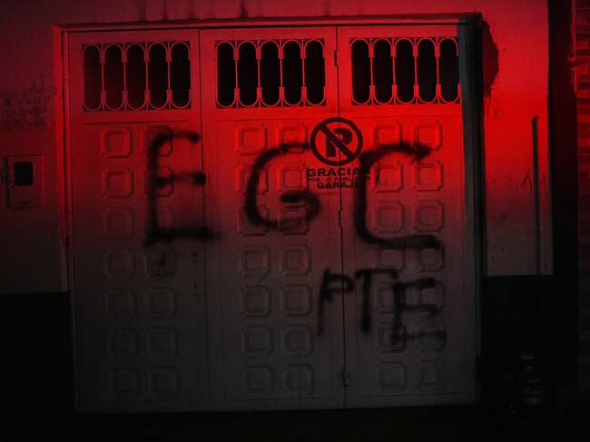 Las siglas del Ejército Gaitanista de Colombia, Clan del Golfo, frente a un puesto de Policía en Ciudad Bolívar, Bogotá. (Juancho Torres/Anadolu vía Getty Images)