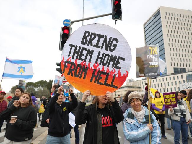 Jerusalén (-), 11/02/2025.- Familiares de rehenes israelíes retenidos por Hamás en Gaza y sus partidarios portan pancartas durante una protesta frente a la oficina del primer ministro Benjamín Netanyahu. / ABIR SULTAN (EFE)