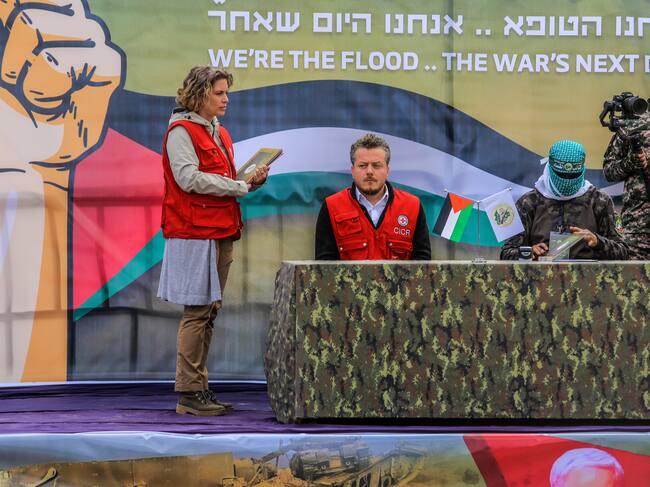 Miembros de Hamás y de la Comité Internacional de la Cruz Roja en libaracion de rehenes. FOTO: Abed Rahim Khatib/picture alliance via Getty Images / picture alliance