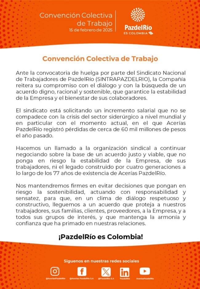 Frente a la convocatoria a huelga por parte del Sindicato Nacional de Trabajadores de PazdelRío (Sintrapazdelrío), la empresa expresa su firme compromiso con el diálogo abierto y la búsqueda de un acuerdo que garantice tanto la estabilidad de la compañía como el bienestar de todos sus colaboradores.