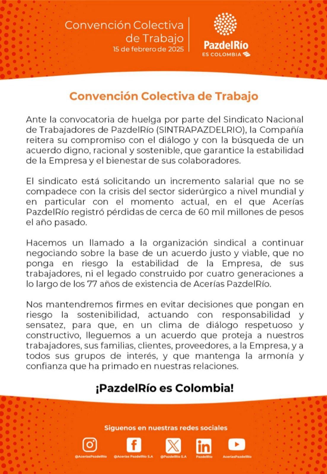 Frente a la convocatoria a huelga por parte del Sindicato Nacional de Trabajadores de PazdelRío (Sintrapazdelrío), la empresa expresa su firme compromiso con el diálogo abierto y la búsqueda de un acuerdo que garantice tanto la estabilidad de la compañía como el bienestar de todos sus colaboradores.