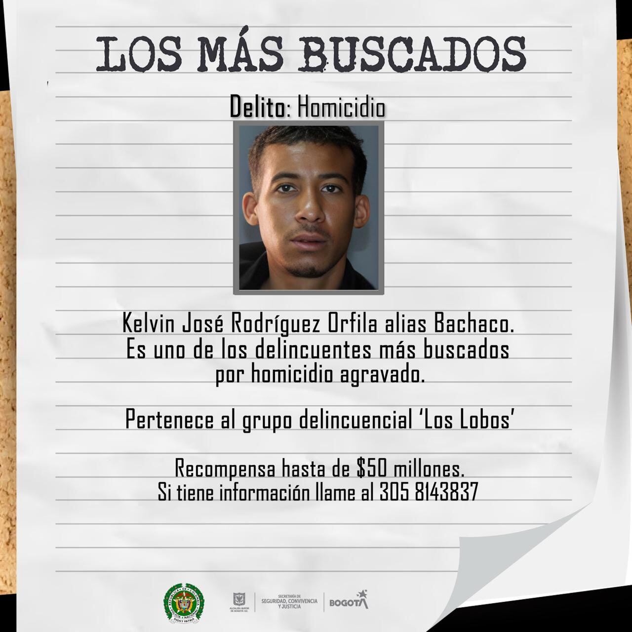 Las autoridades en Bogotá están detrás de la pista de Kelvin José Rodríguez Orfila, alias ‘Bachaco’, un delincuente que pertenece al grupo de ‘Los Lobos’ y se busca por los delitos de: homicidio agravado, tráfico, porte o tenencias de armas de fuego, partes o municiones con influencia en las localidades de Chapinero y Barrios Unidos.