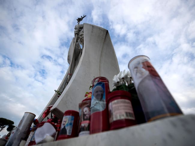 ROMA (Italia), 20/02/2025.- Flores y velas son depositadas a los pies de una estatua del Papa San Juan Pablo II fuera del Hospital Universitario Gemelli, donde el Papa Francisco está hospitalizado para pruebas y tratamiento de bronquitis. / ANGELO CARCONI (EFE)