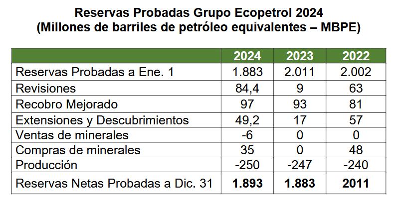 Según el más reciente informe de Ecopetrol, al cierre de 2024 sus reservas probadas netas alcanzaron los 1.893 Millones de Barriles de Petróleo Equivalente (MBPE), lo que significa un incremento de 10 Millones de Barriles de Petróleo Equivalente frente al 2023.
