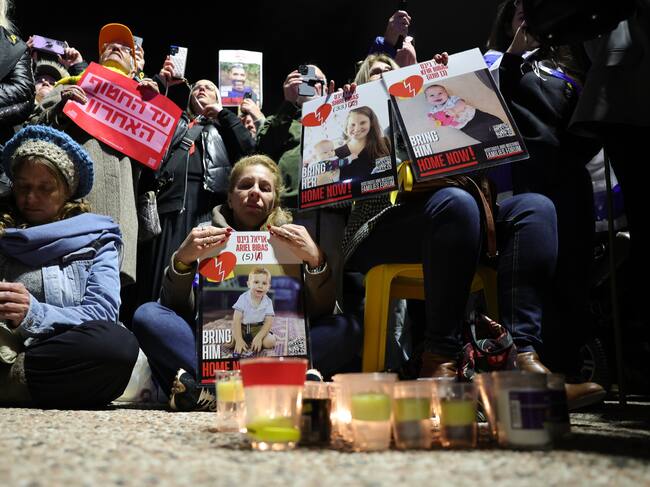 Tel Aviv (Israel), 20/02/2025.- Varias personas se reúnen para encender velas en la Plaza de los Rehenes tras la liberación de los cadáveres de cuatro rehenes israelíes retenidos en Gaza. / ABIR SULTAN (EFE)