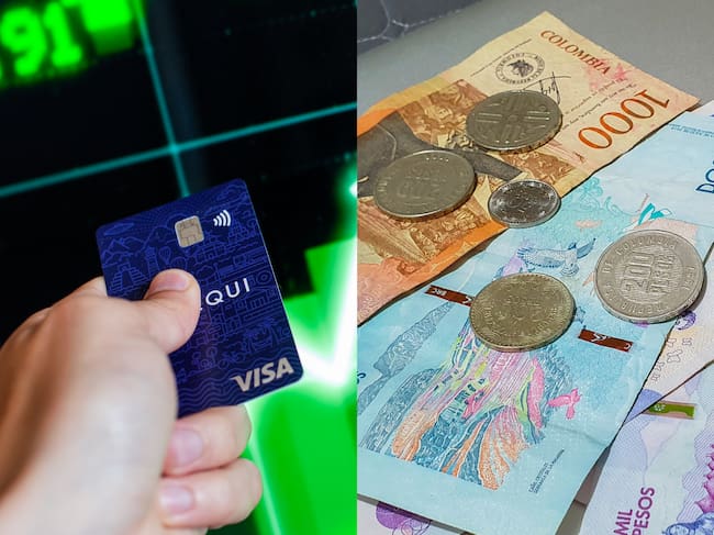 Imagen de referencia de una tarjeta de Nequi (Sebastián Barros/NurPhoto vía Getty Images) y dinero colombiano en efectivo (Kryssia Campos/Getty Images)