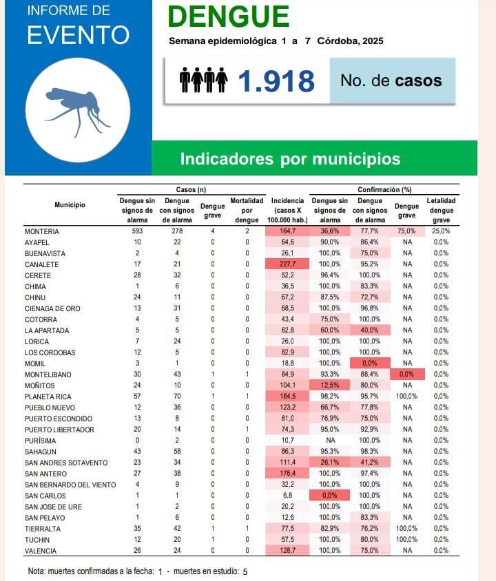 Las autoridades de salud prendieron las alarmas en el departamento de Córdoba, donde se han disparado los casos de dengue en lo que va corrido del año 2025. Montería, Canalete, Moñitos, Planeta Rica, Pueblo Nuevo, San Andrés de Sotavento, San Antero y Valencia, son las zonas con mayor incidencia.