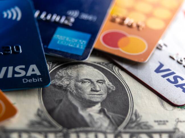 BATH, REINO UNIDO - 04 DE FEBRERO: El logotipo de Visa, Mastercard y American Express en varias tarjetas de crédito y débito junto a billetes estadounidenses de un dólar. Getty Images / Anna Barclay