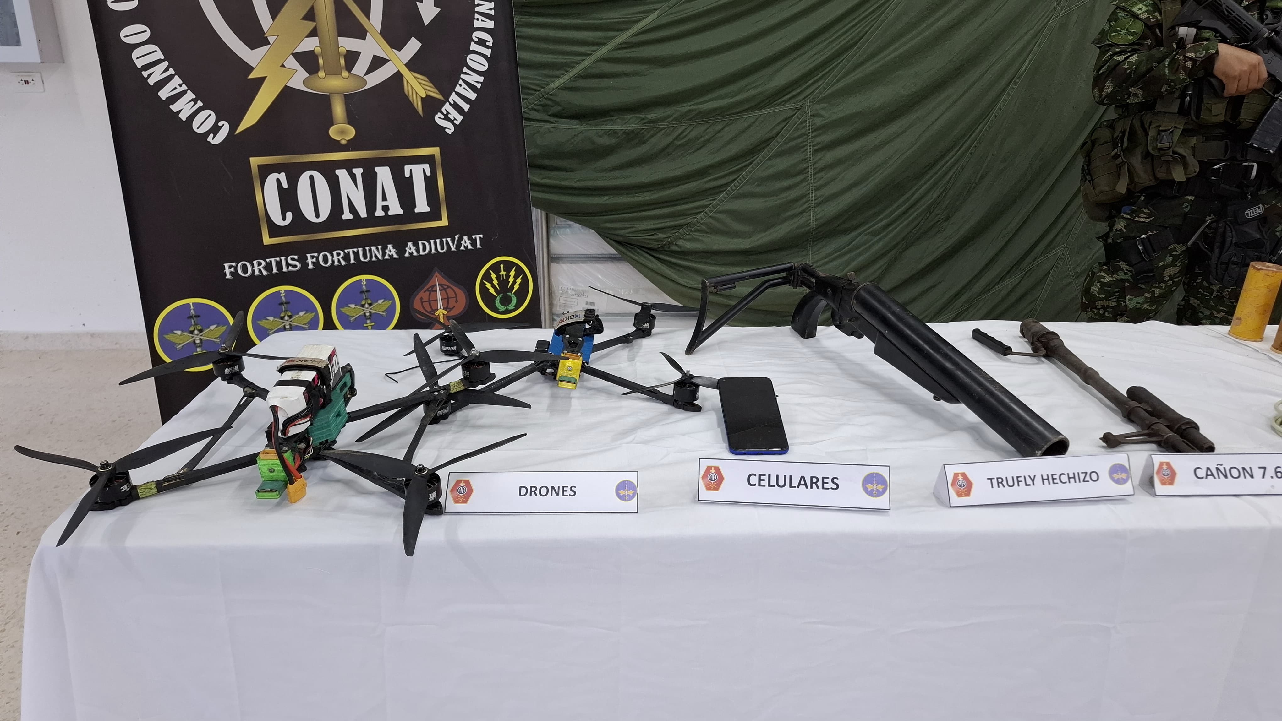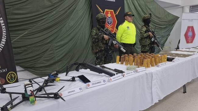 Entre el material de guerra incautado se encuentra además 1.122 cartuchos, 76 detonadores aneléctricos, 39 unidades con 13.162 kilogramos de pentolita pentoflex, un lanzagranadas hechizo, proveedores para fusil, granadas de mortero, cordón detonante y un repuesto para ametralladora calibre 7.62 milímetros. Además de los dos drones y un celular.