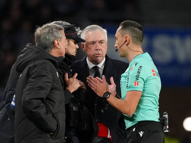 Árbitro José María Sánchez Martínez habla con Carlo Ancelotti y con Imanol Alguacil. FOTO: Juan Manuel Serrano Arce/Getty Images / Juan Manuel Serrano Arce