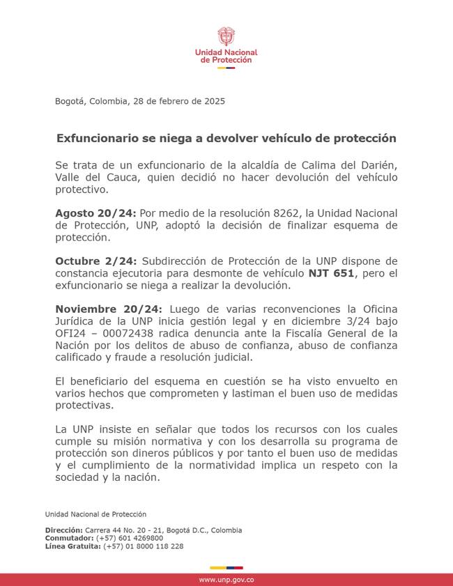 Tras el escándalo, la UNP emitió un comunicado en el que señaló que el exalcalde se ha negado a devolver el vehículo a pesar de que su esquema de protección fue finalizado en agosto de 2024.