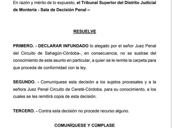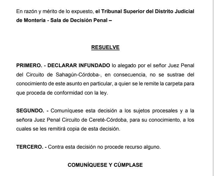 Finalmente, sostiene que “conforme con lo anterior, la Sala declarará infundado lo alegado por el señor Juez Penal del Circuito de Sahagún. En consecuencia, no se le separará del conocimiento del asunto, debiendo continuar con su desarrollo, resultando menester indicar que por tales razones no se le dará trámite al impedimento manifestado por la señora Juez Penal del Circuito de Cereté-Córdoba, a quien también se le comunicará esta decisión para su conocimiento, y contra la misma no procede recurso alguno”.