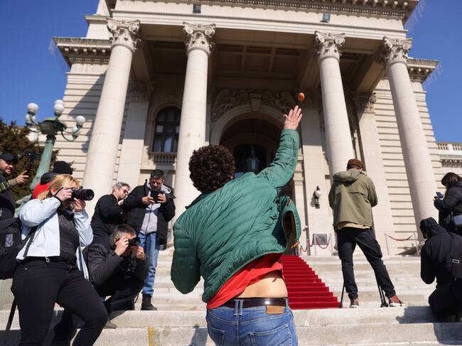 Manifestante lanzando huevos al edificio del parlamento serbio. FOTO: EFE/EPA/ANDREJ CUKIC. / ANDREJ CUKIC (EFE)