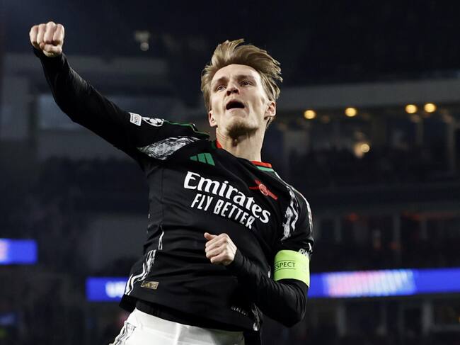 Martin Odegaard del Arsenal FC celebra el cuarto gol en los octavos de final de la Champions League. FOTO: EFE/EPA/MAURICE VAN STEEN / MAURICE VAN STEEN (EFE)