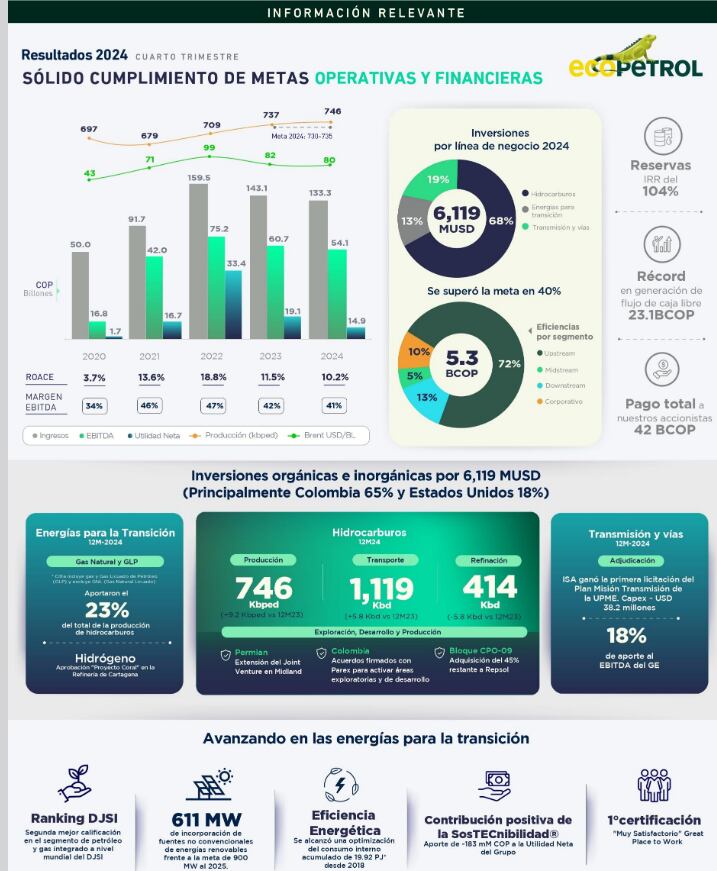 Asimismo, por el lado de los ingresos para todo 2024, Ecopetrol registró una cifra de $133.3 billones de pesos, cifra inferior a la registrada durante el 2023 en 6,8%, cuando se ubicó en $143.3 billones.