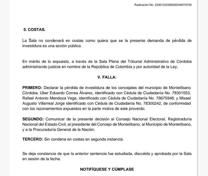 El Tribunal Administrativo de Córdoba recientemente declaró la pérdida de investidura de los concejales del Partido de La U, Misael Augusto Villarreal Jorge, Rafael Antonio Mendoza Vega y Uber Eduardo Correa Álvarez, por conflicto de intereses en la elección del secretario general del Concejo de Montelíbano, Emilio Enrique Mendoza Jerez para el periodo 2024.