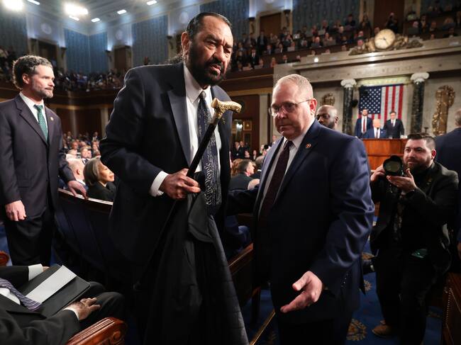Al Green, de 78 años, se levantó y movió su bastón para replicar a Trump, pero su protesta fue ahogada por gritos de la bancada republicana y luego fue acompañado por personal de la Cámara hacia la salida, después de que fuera llamado al orden por el presidente de la Cámara de Representantes, el republicano Mike Johnson.