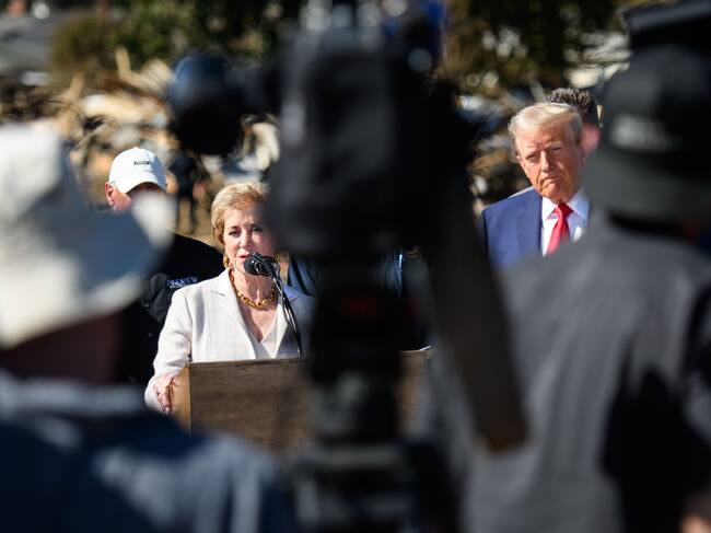 El presidente Donald Trump y la secretaria de Educación Linda McMahon, en una rueda de prensa tras la visita de Trump a Swannanoa por la devastación del huracán Helene, el 21 de octubre de 2024. / The Washington Post