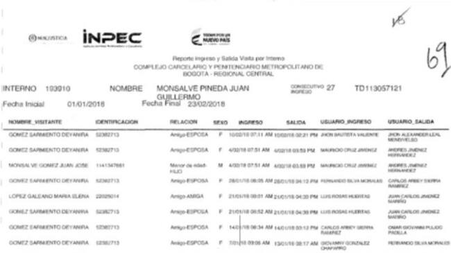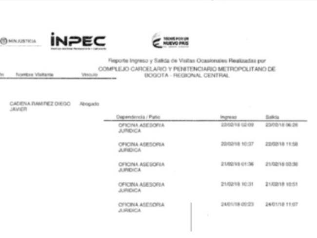 Aquí se observa el registro de los ingresos de Cadena a La Picota: