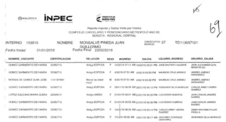 Aquí se observa el registro de los ingresos de Cadena a La Picota: