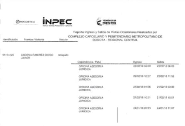 Según su testimonio, Cadena visitó a Juan Guillermo Monsalve los días 21, 22 y 24 de febrero de 2018. Monsalve, quien cumple condena en La Picota, es testigo clave en el proceso que vincula a Uribe con grupos paramilitares.