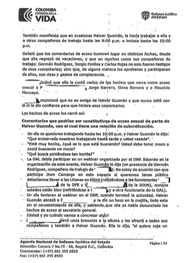 Adicionalmente, citaron los nombres de varias personas que podrían testificar sobre los presuntos hechos de acoso sexual de la persona que, afirman, Llinás Chica llevó a la DIAN, así como menciones anónimas de los ingresos a la DIAN por parte del director de Contrainteligencia de la DNI y Helver Alberto Guzmán sin explicación clara.