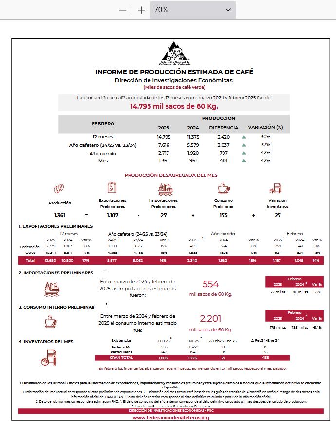 Al revisar la producción que se registró exclusivamente para febrero del presente año, también se encontraron números muy positivos ya que se ubicó en 1.361.000 sacos, lo que deja ver un crecimiento del 42% al compararse con el mismo mes del 2024, cuando la cifra de producción fue de 1.920.000 bultos.