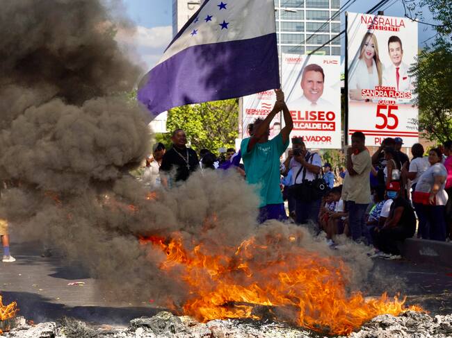 TEGUCIGALPA (HONDURAS), 09/03/2025.- Simpatizantes del Partido Nacional de Honduras ondean banderas y queman llantas en una calle exigiendo que lleguen urnas de votación a su barrio. / STR (EFE)