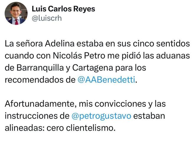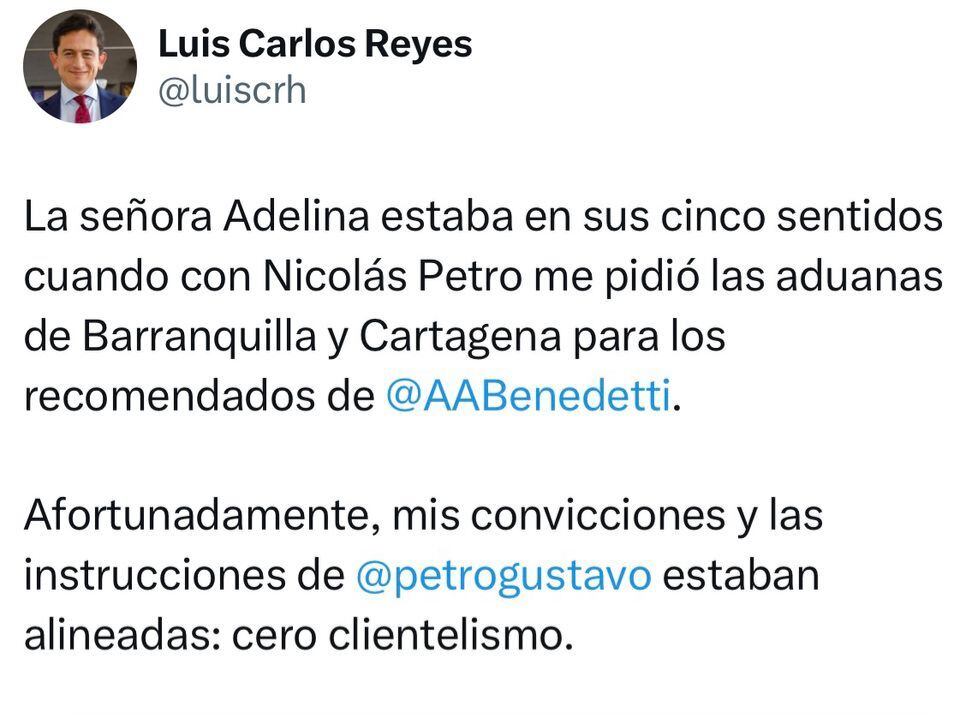 “La señora Adelina estaba en sus cinco sentidos cuando con Nicolás Petro me pidió las aduanas de Barranquilla y Cartagena para los recomendados de Armando Benedetti. Afortunadamente, mis convicciones y las instrucciones de Gustavo Petro estaban alineadas: cero clientelismo”, escribió Reyes en sus redes sociales.
