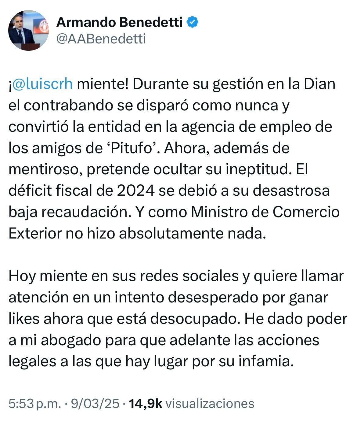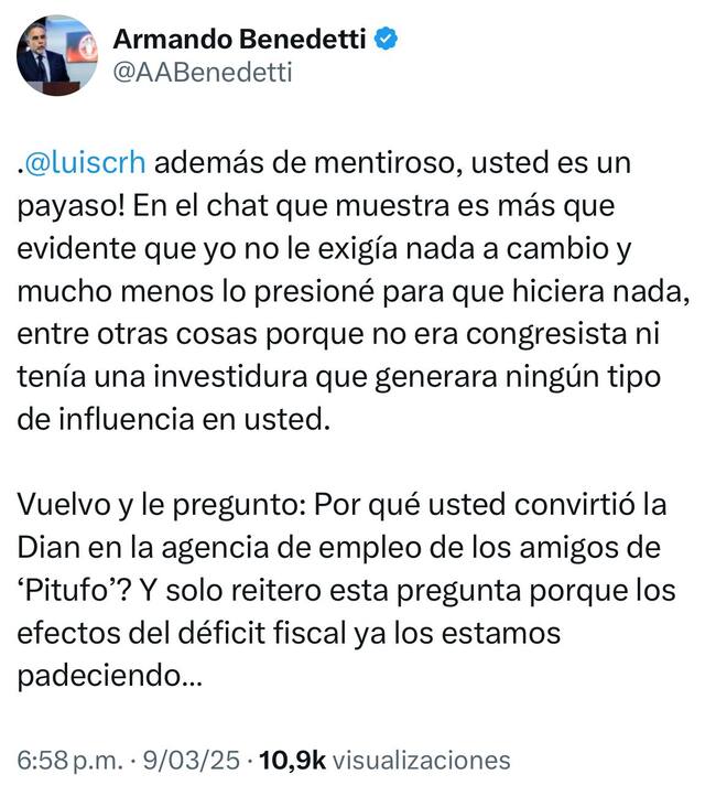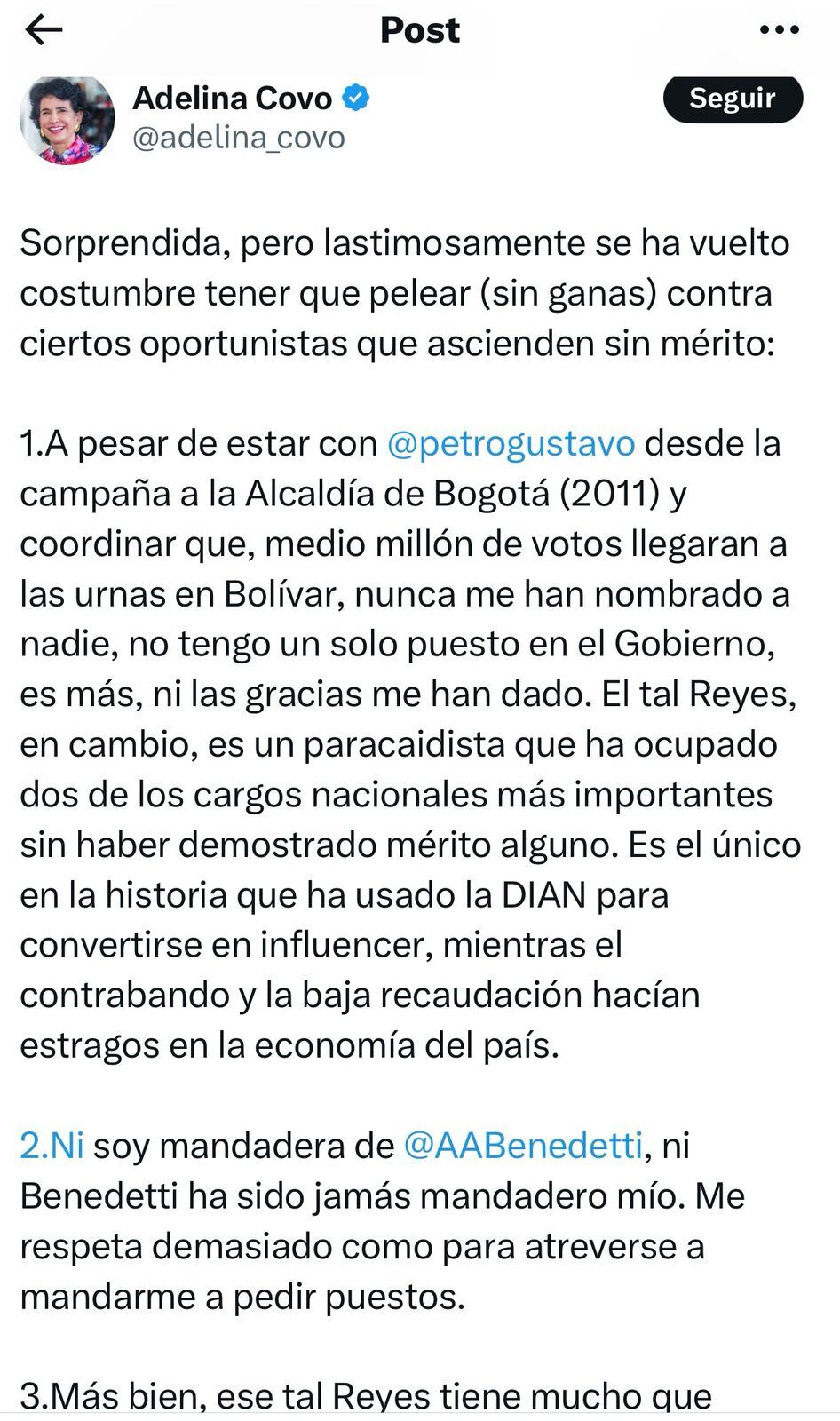 Tras ellos, Adelina, suegra de Benedetti escribió en sus redes sociales: “2. Ni soy mandadera de Armando Benedetti, ni Benedetti ha sido jamás mandadero mío. Me respeta demasiado como para atreverse a mandarme a pedir puestos. 3. Más bien, ese tal Reyes tiene mucho que explicar: ¿por qué insiste en lanzar tantas cortinas de humo? ¿A quién está tratando de proteger con su show en redes? Ahora, sin cargo ni poder, solo le queda la difamación como estrategia”.