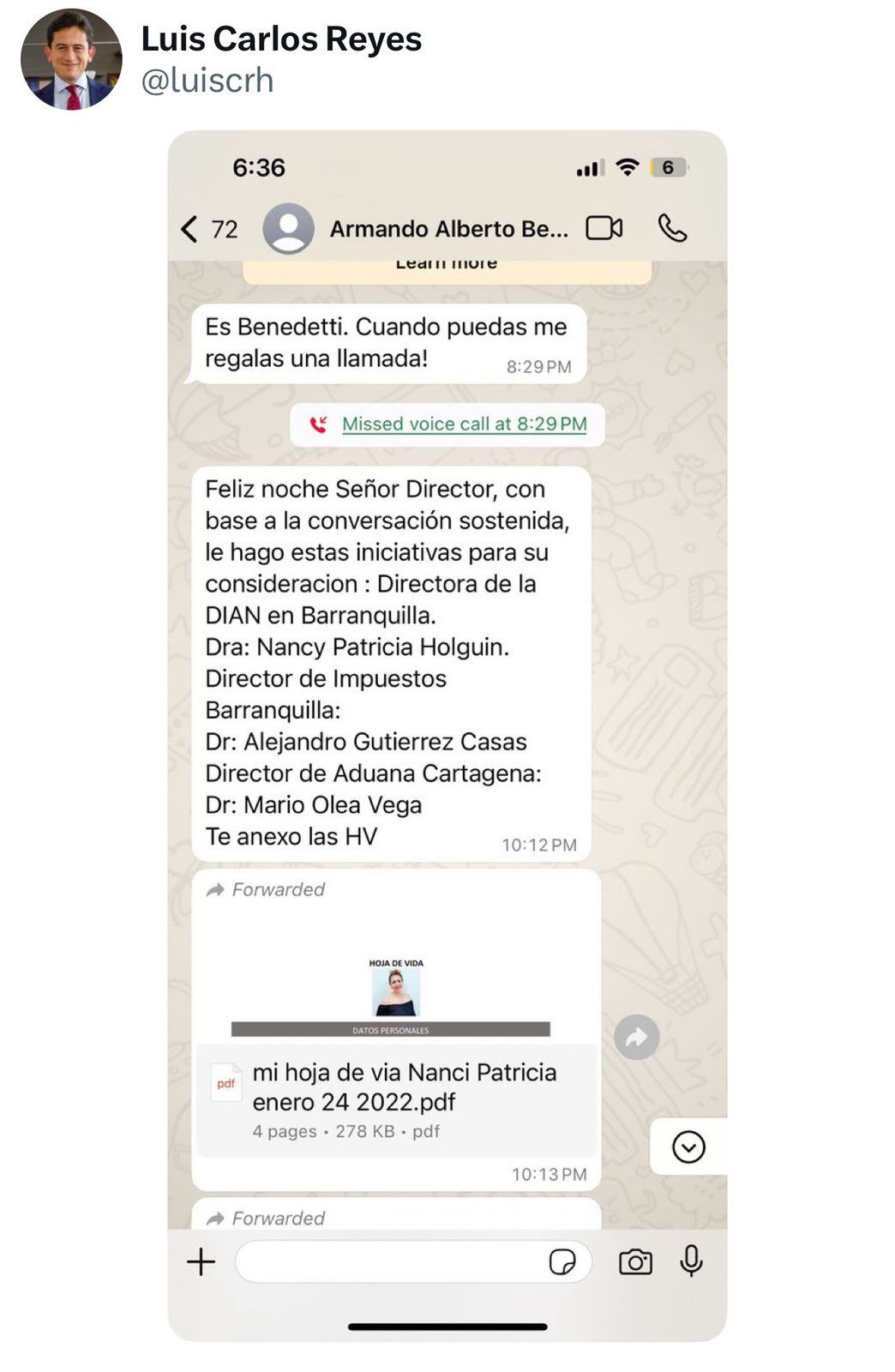 En el chat se lee que Benedetti escribió: “Feliz noche Señor Director, con base a la conversación sostenida, le hago estas iniciativas para su consideración: directora de la DIAN en Barranquilla. Dra: Nancy Patricia Holguin. Director de Impuestos Barranquilla: Dr: Alejandro Gutierrez Casas. Director de Aduana Cartagena: Dr: Mario Olea Vega. Te anexo las HV”.