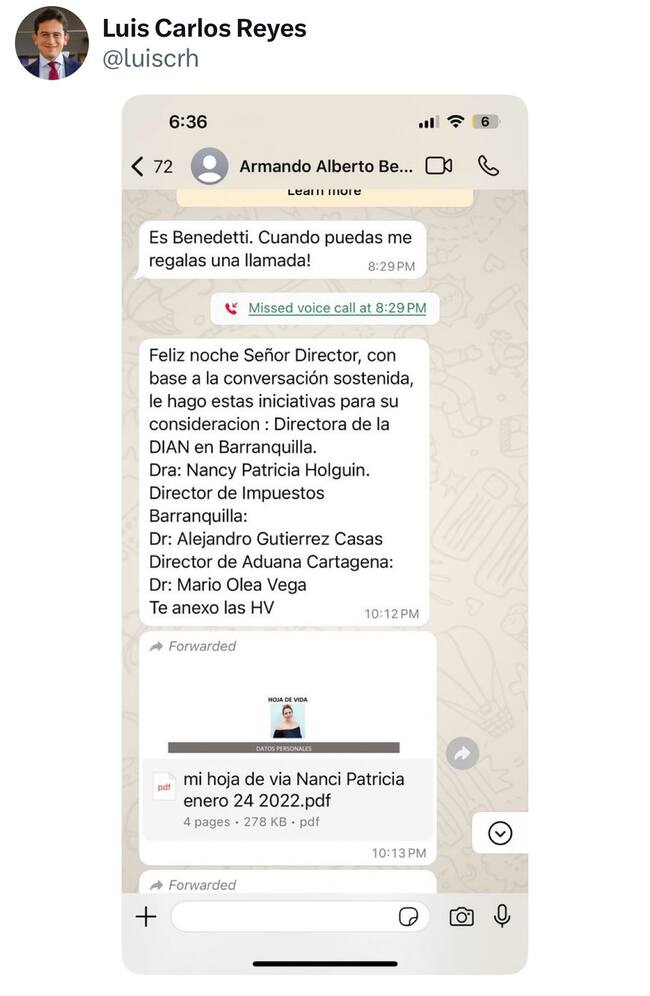 En medio de un cruce de mensajes, el exdirector de la Dian, Luis Carlos Reyes, reveló este domingo un chat entre él y el hoy ministro del Interior, Armando Benedetti, en el que este le recomienda y envía las hojas de vida de algunas personas para nombrarlas en las direcciones clave.