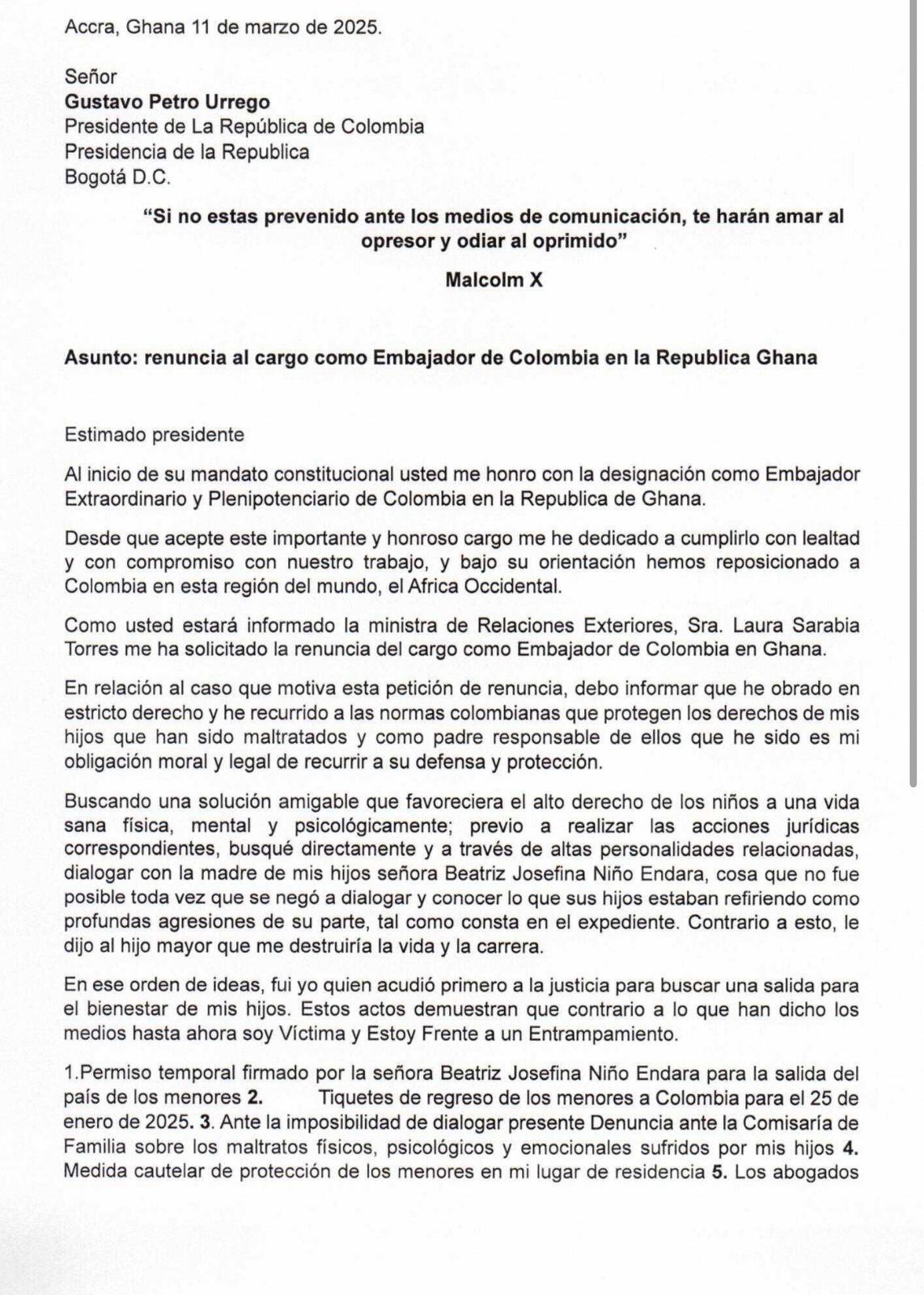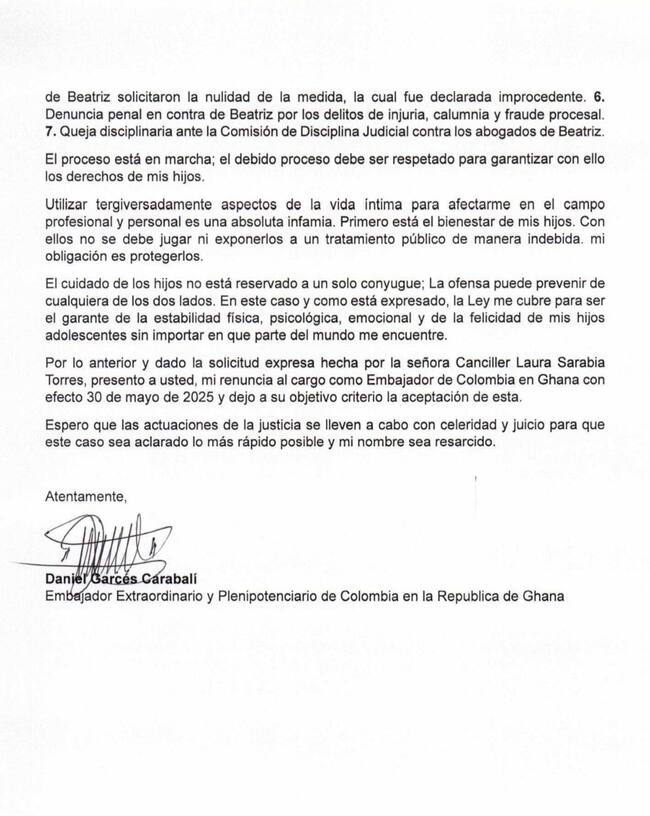 En su carta, el saliente embajador Garcés se dirige a la canciller Laura Sarabia: “Presento ante usted mi renuncia al cargo como embajador de Colombia en Ghana con efecto 30 de mayo de 2025 y dejo a su objetivo criterio la aceptación de esta. Espero que las actuaciones de la justicia se lleven a cabo con celeridad y juicio para que este caso sea aclarado lo más rápido posible y mi nombre sea resarcido”.